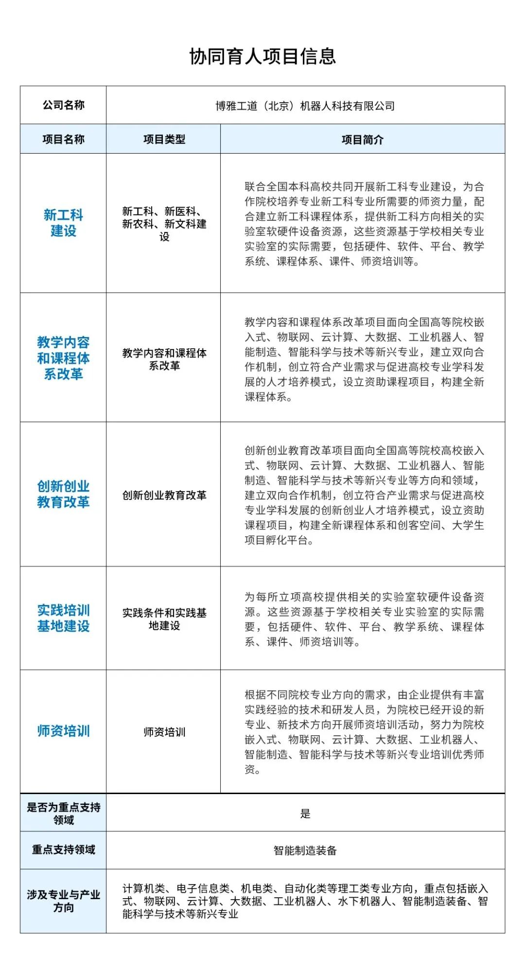 教育部公布了2023年7月產學合作協同育人項目申報指南通過企業名單,博雅工道(北京)機器人科技有限公司積極響應號召并成功入選。