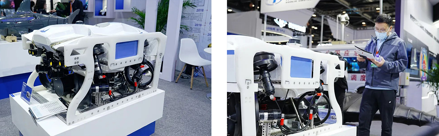博覽會現(xiàn)場,輕型作業(yè)級水下機器人 R-150 初次公開。R-150 具有高性能、強海況適應性等特點,采用高強度框架材料和大功率推進系統(tǒng),拓展能力強,可以滿足一定強度的海工作業(yè)需求。其優(yōu)越的性能指標媲美國外同量級競品,實現(xiàn)國產(chǎn)化替代。