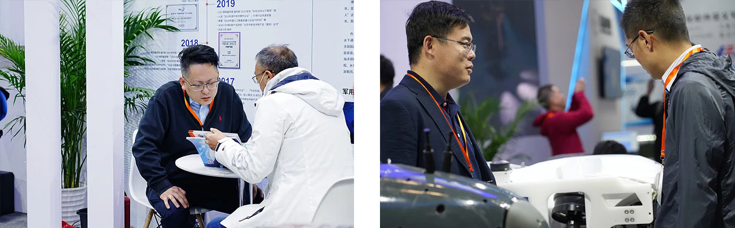 水下機器人是什么?它能做什么用?它的動力來源是什么?在渾濁水體內(nèi),機器人如何完成任務?仿生機器人的運動原理是什么?它能不能達到我的任務需求?許多參觀者都帶著疑問來到我們的展臺。針對這些問題,產(chǎn)品、技術、業(yè)務相關的負責人在現(xiàn)場逐一為來訪觀眾解答,現(xiàn)場討論氣氛熱烈。