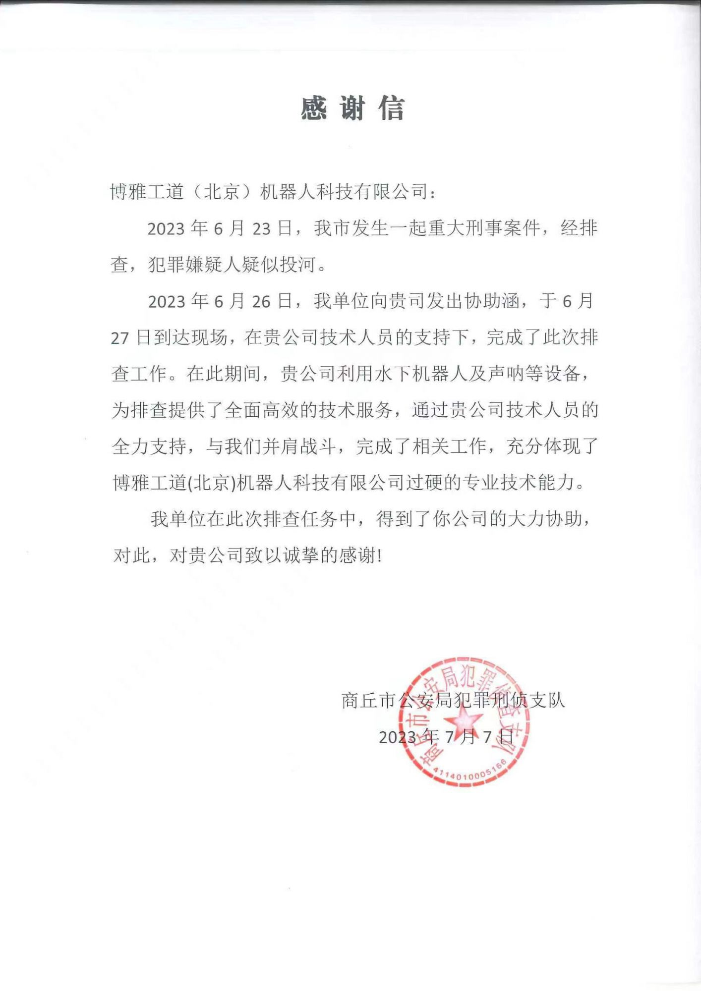 案件偵查結束后警方發來感謝信,對博雅工道的水下機器人的優異性能及現場工作人員的技術能力給予充分肯定。