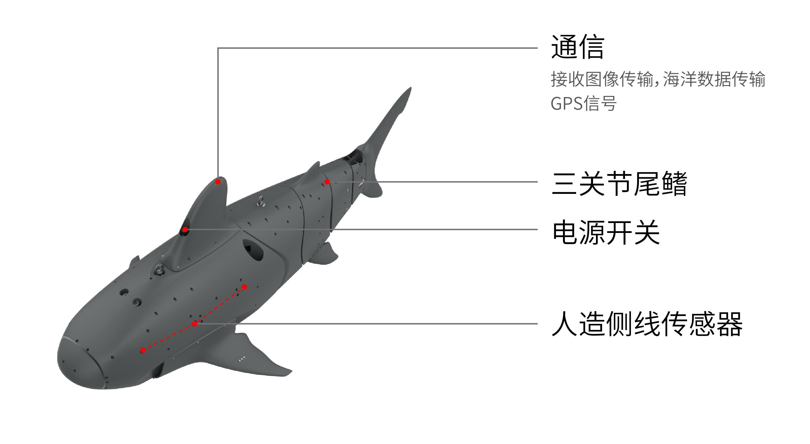BS-500是一款以大白鯊為原型,利用仿生魚尾作為動力源的仿生機器人產品,具有低功耗、長續航、速度快、低噪音、操控靈活等特點。鯊魚型仿生機器人可以實現靜水定點懸停、遠距離無線控制、預設軌跡自主巡游等功能。